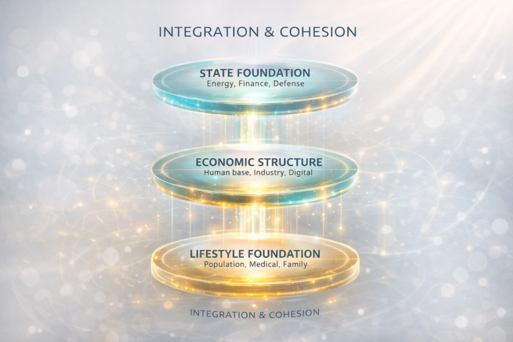 この統合像は、経済社会構造を通じて国家社会基盤と生活社会基盤を接続し、社会全体の安定循環を成立させる設計思想として位置づけられます。